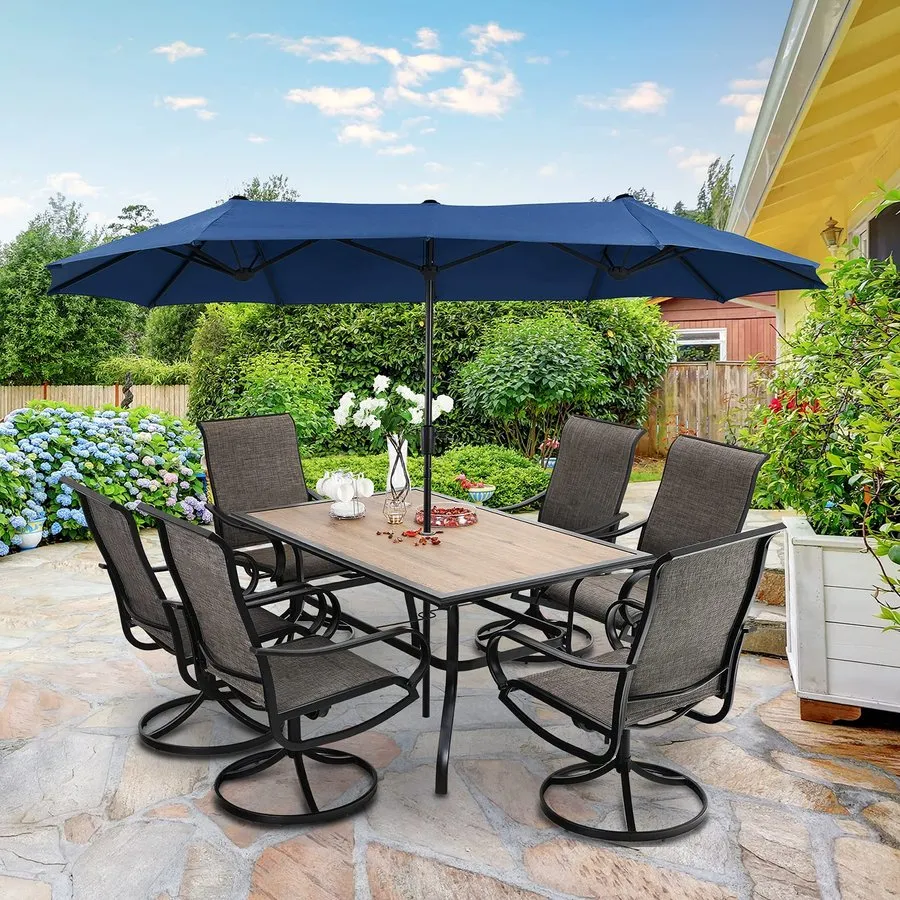 Juego de comedor de patio de 8 piezas con sombrilla, juego de muebles de exterior con 6 sillas giratorias de comedor
