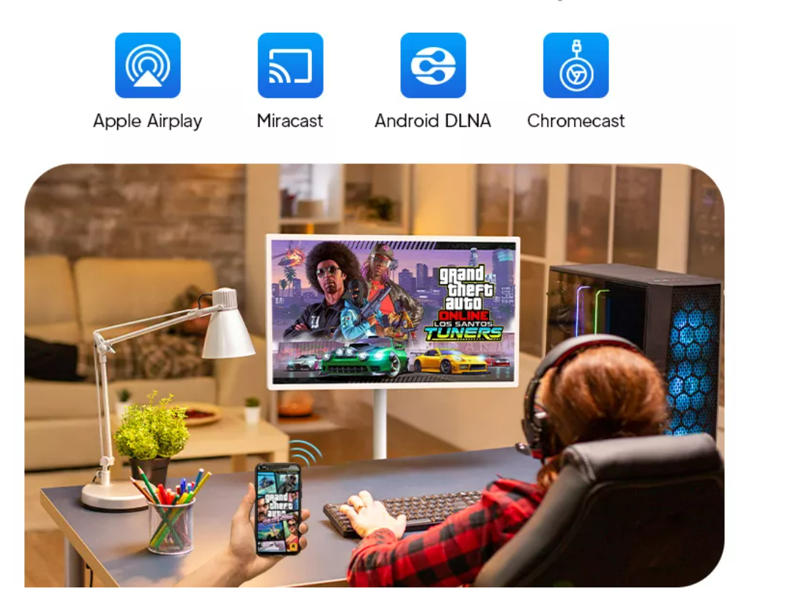 Admite dispositivos de proyección de pantalla de teléfonos móviles iPhone y Android, y también se puede utilizar para transferencia de archivos y conexiones de señal de audio y video por cable para eliminar la incomodidad del televisor en la vida diaria.