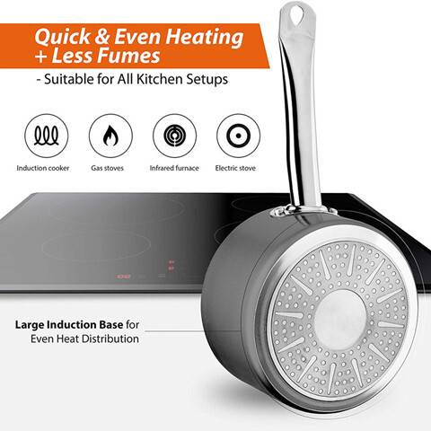 - Innovative Design - The induction pan set was designed with the user in mind. The pieces in this kitchenware set are sturdy (2.8mm thick) meaning they'll never warp, and the ergonomic handles are designed to maximize airflow so they don't conduct heat.