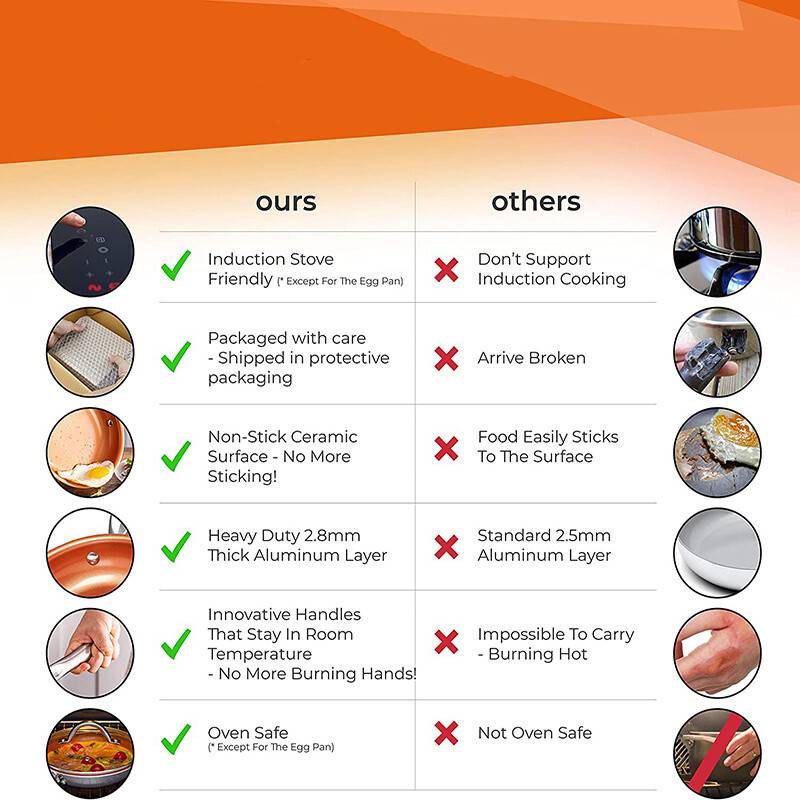 - SUITABLE FOR ALL STOVES INCLUDING INDUCTION - Unlike competing non-stick pot and pan sets, the copper cookware in this set is induction compatible and oven safe (not the egg pan).