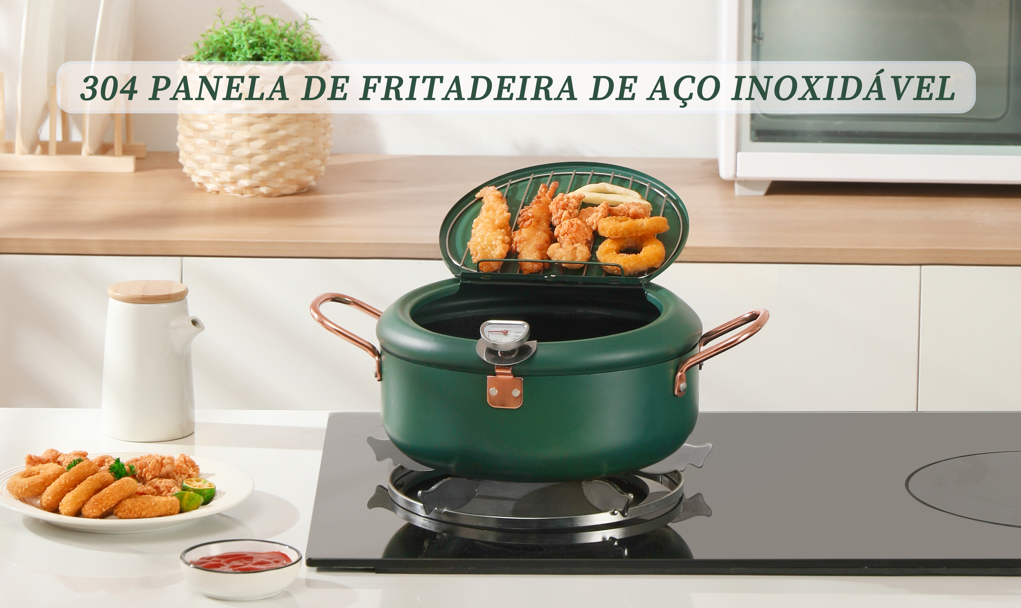 • 304 Frigideira De Aço InoxidÁvel, fritadeira com proteção contra respingos, controle de termômetro e tampa