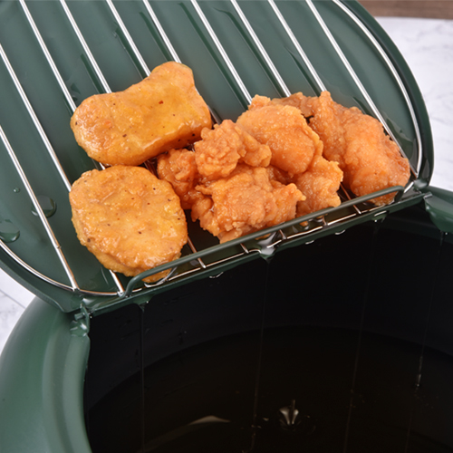 Tampa de concha angulada com grade de filtro de óleo removível. Este design pode ajudar a filtrar o excesso de óleo na comida e pingar de volta na panela, tornando-a mais saudável.